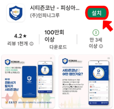 경찰에서 배포하는 전화금융사기 탐지 앱으로 악성앱을 실시간으로 탐지하고 즉시 삭제 할 수 있는 '시티즌 코난' 앱으로 재산을 지키기 위해 아래 버튼으로 설치하시기 바랍니다.